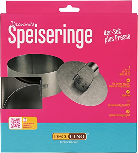Decocino Matseringar set om 4 med press – Ø 10 cm, 4 cm höjd – dessertringar i rostfritt stål för bakning, formning och lagring av desserter, hamburgare patty och mycket mer.