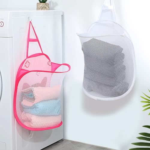 Baby tvättkorg barnrum liten, 2-pack tvättkorg barn liten mesh pop up tvättkorg barn hängande tvätt hammare för barnspjälsäng, leksak, tvättförvaring (rosa + vit)