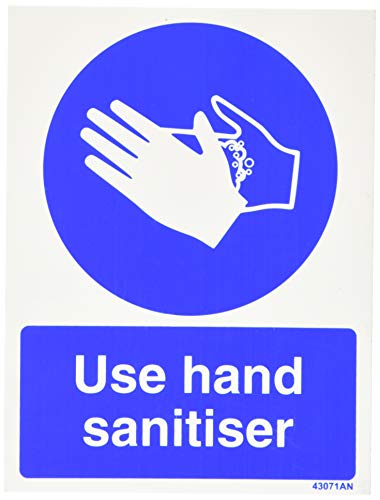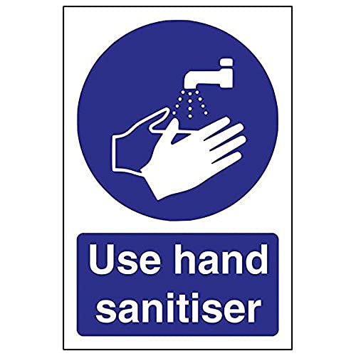 VSafety 43071AN-R Obligatorisk allmän skylt, styv plast, Use Hand Sanitiser", porträtt, 150 mm x 200 mm, blå