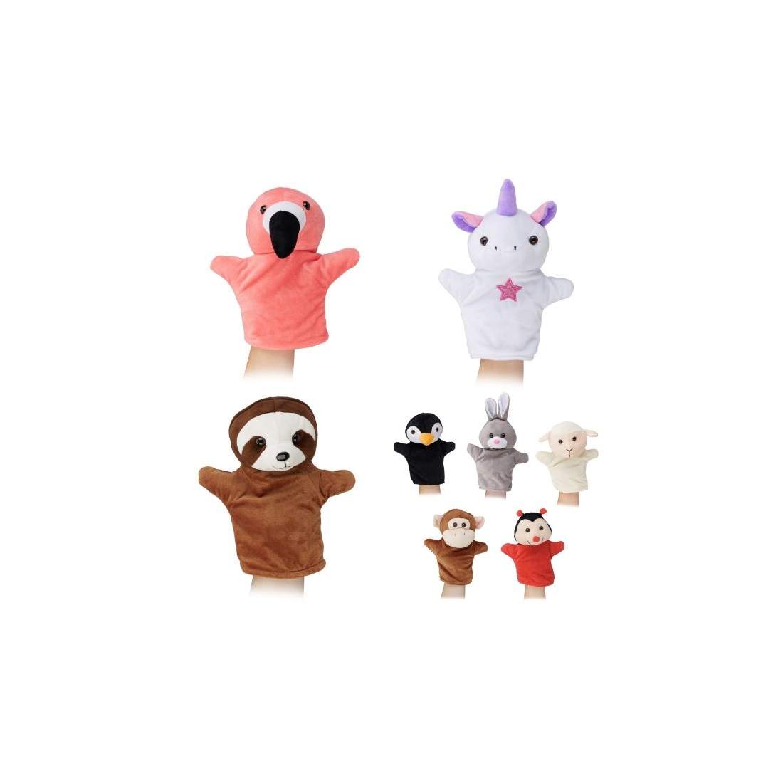 Relaxdays handdockor för barn, uppsättning av 8 djur, apa, enhörning, sengångare, flamingo, handleksaksdockor, mjuk plysch, färgglada