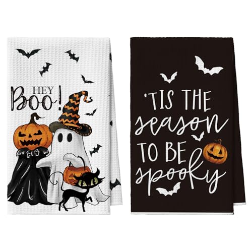 Artoid Mode spöke fladdermöss pumpor katt halloween kökshanddukar diskhanddukar, 42 x 65 cm Hey Boo säsongsbetonad höst dekoration handdukar set med 2