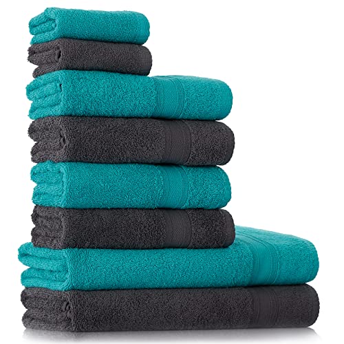 Tuiste Handduksset grå – turkos | %100 bomull frotté handdukar set 8 delar | 2 x badhanddukar set, 4 x handdukar, 2 x gästhanddukar | mjuka och absorberande | Färg: Grå – turkos