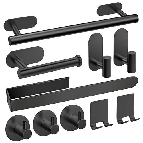 AIKER Handdukshållare, 10 st badrumstillbehör av högkvalitativt förtjockat 304 rostfritt stål, ingen borrning självhäftande handdukshängare, lämplig för badrum/kök svart