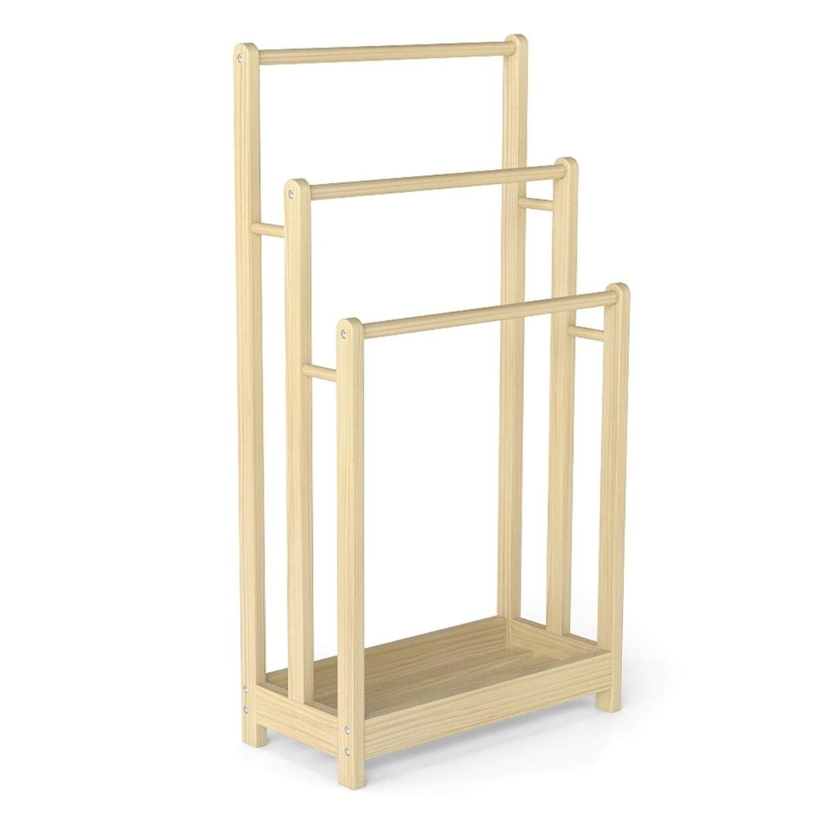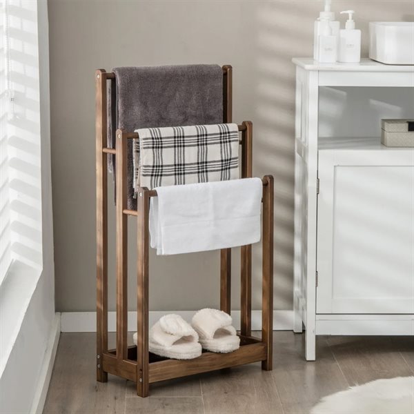 Fristående handdukshängare i trä – 3 våningar med hyllplan, brun
