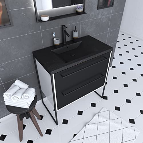 Aurlane badrumsmöbel 80 x 50 cm matt svart - 2 lådor vit - svart harts handfat sten effekt