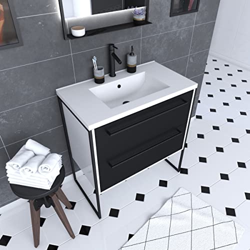 Aurlane badrumsmöbel 80 x 50 cm matt svart - 2 lådor matt svart - vit handfat - STRUCTURA P054