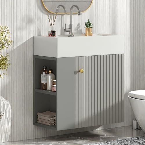 YLSZHY 55 cm flytande badrumsskåp med keramiskt handfat, modernt väggmonterat handfat med räfflad dörr och öppen hylla för hem badrum litet utrymme, utan kran (grå)
