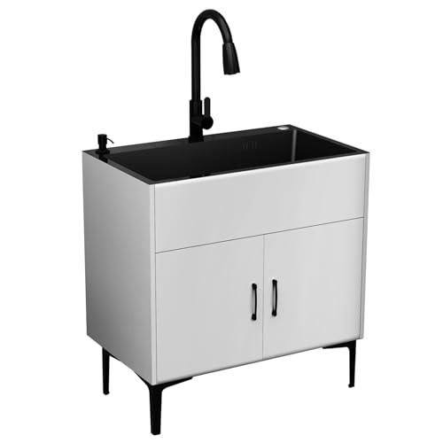 Tvättstuga med skåp, rostfritt stål handfat, kökshandfat och skåp Combo, djupt badrum handfat med neddragbar kran, för grovkök, garage, pentry, mudroom(Wit,75x45x78cm)
