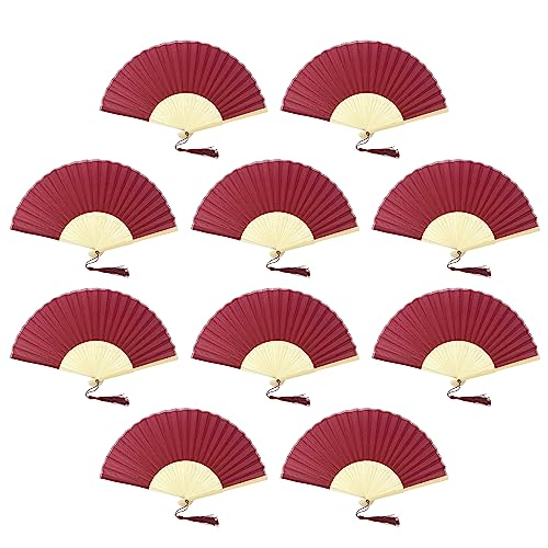FANSOF.FANS Paket med 10 Handhållen fläkt i tyg med tofs klass A bambu ribbor fest bröllop tjänst (mörkröd, rödbrun)