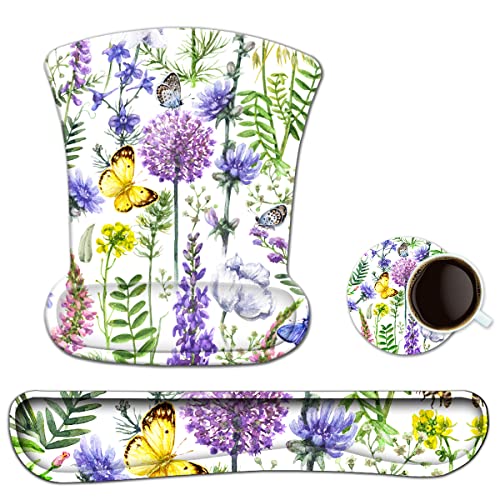Tangentbordsdyna handledsstöd musmatta, ToLuLu gel ergonomiska musmattor för dator bärbar dator kontor, musmatta tangentbord handledsstöd minnesskum för enkel skrivning och smärtlindring, lila blommig gul fjäril