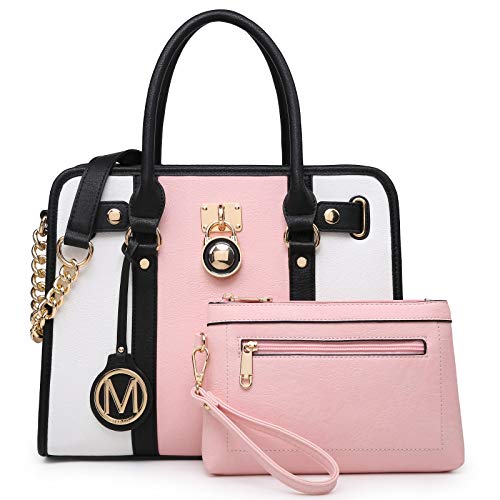 MKP kvinnor skolväska handväskor två toner topphandtag tygväska axelväskor med matchande handledsväska plånbok set 2 st, Rosa/vit, 13.75"W x 11"H x 6.25"D