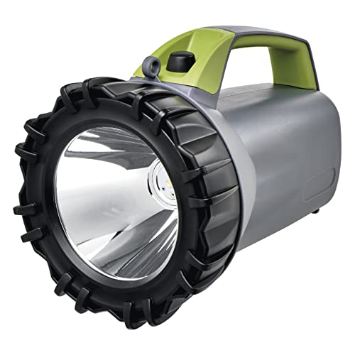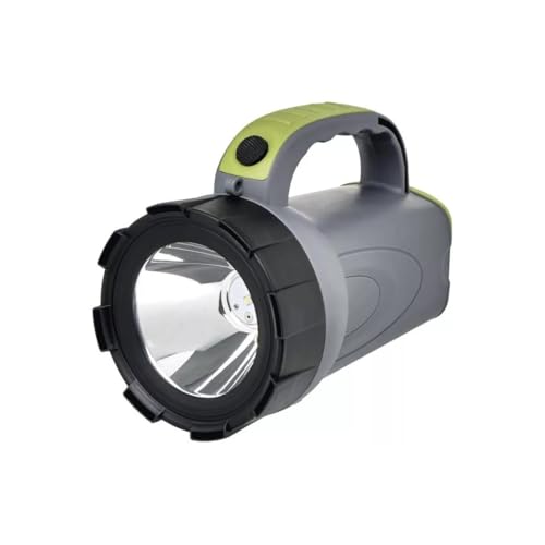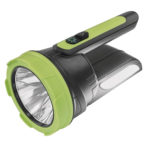 EMOS – uppladdningsbar LED-handstrålkastare – 300 lm, max. 370 m – 2 ljuslägen – 30 timmar - med halkfritt handtag och bärrem – med laddkabel/biladapter – för utomhusbruk – grå-svart-grön