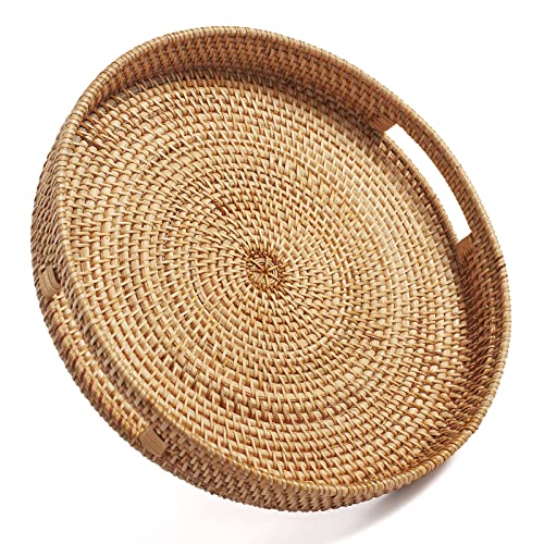 SLHEQING Rund rotting serveringsbricka med handtag, dekorativ soffbord, bricka, flätbricka för frukt, dryck, bröd, te, ljus