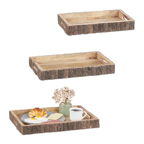 Relaxdays bricka i set om 3, olika storlekar, serveringsbricka av mangoträ, träbricka med handtag, dekorativ bricka, natur