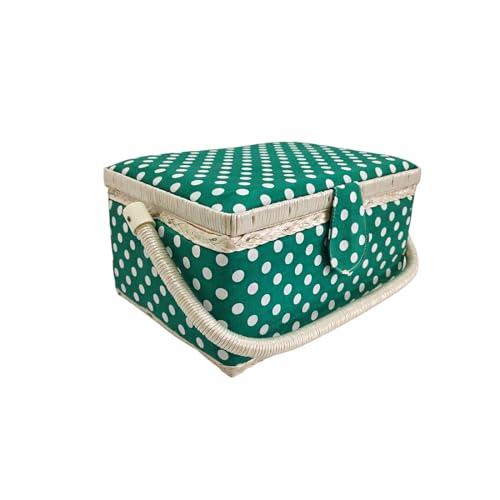 JYC KREATIV stor sylåda i trä, tygfodrad sybox med 8 fack, organiserare med stift, förvaringslåda med handtag och bricka, (gröna prickar, stor)