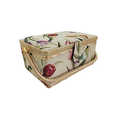 Träsöm, tygfodrad sylåda med 8 fack, organisatör med pincett, förvaringslåda med handtag och bricka, (tulpan, medium)