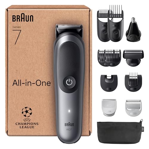 Braun Series 7 allt-i-ett-klippare, 12-i-1-kit, ProBlade AutoSense, 120 min drifttid, SkinGuard-skydd, tonat skägg, bekvämt AquaGrip handtag under vattnet, AIO7545, grå
