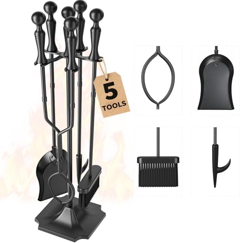 Amagabeli 67,3 cm (26,5 tum) 5 st eldstadsverktyg set svart handtag smidesjärn stor brandverktygssats och hållare utomhus eldstad eldstad stativ inomhus rustika tänger spade antik borste skorsten
