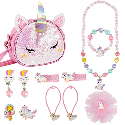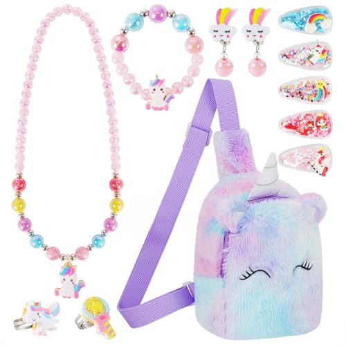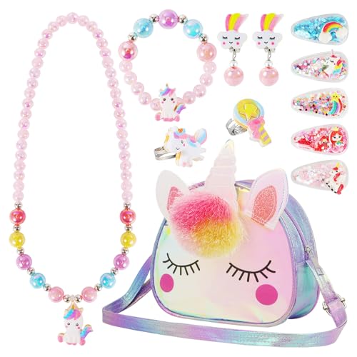 VGMANTA Enhörning presenter för flickor enhörning leksak present flicka 5 år födelsedagspresent handväska flicka enhörning barn smyckeset flickor barnsmycken prinsessa leksak lila, Medium, polyester