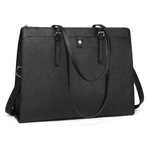 ECOSUSI Laptop handväska damer, laptopväska 15,6 tum, stor shoppingväska, läderväska, axelväskor, business arbetsväska, 1-Svart