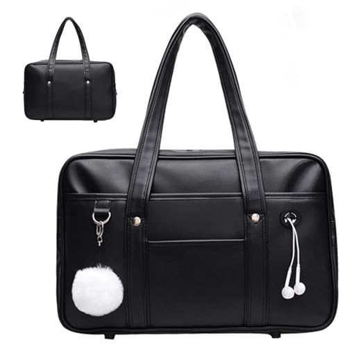 Axelväska för skola, japansk skolväska, stor kapacitet PU-läder japansk med flera fickor, handväska med hörlurskabelhål, dragkedja axel för studentuniform laptop