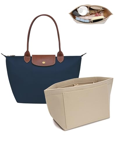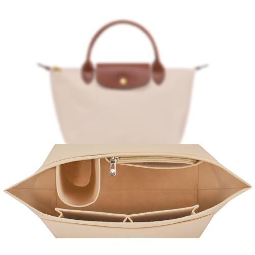 Berelin väska insats, organiserare, handväskinsats organisatör med dragkedja, flera fickor filt handväska organisatör för inlägg plånbok organisera, vikbar tygväska organisera för Longchamp (beige, L)