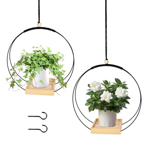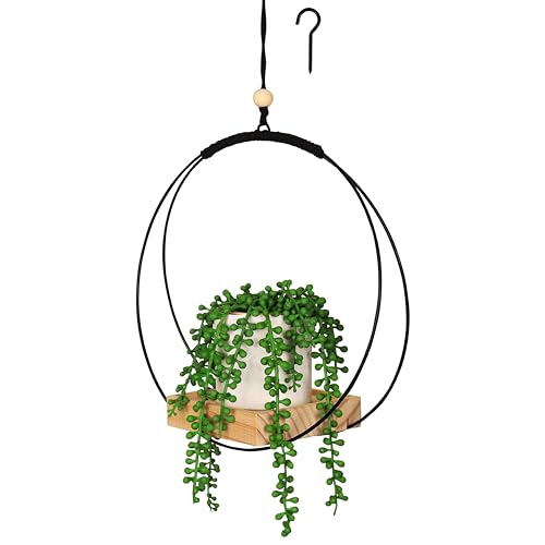 YHNDECO 2 stycken amplar hängande inomhus, svart metall blomkruka hängande ampel med träbas, hängande ampel blommor, hängande växter kruka för inomhusväxter suckulenter luftväxter kaktus