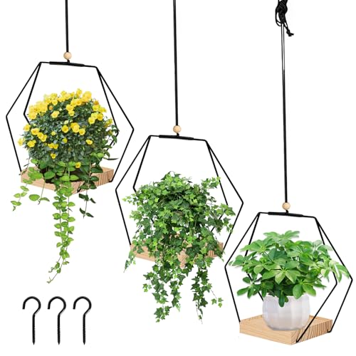 3 stycken amplar hängande inomhus, blomkruka hängande med träbas, metallring, takkrok, boho hängande kruka för växter, svart hängande blomkruka, hängande ampel blommor, hängande växter kruka