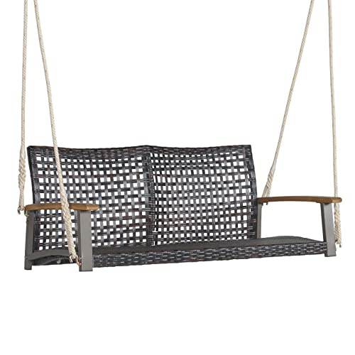 COSTWAY Gungbänk, 2-sits, hängande bänk PE-rotting med kudde, trädgårdsgunga för upphängning, upp till 360 kg, hollywoodgunga med akaciatarmstöd, gunga för trädgård, balkong, veranda (svart)