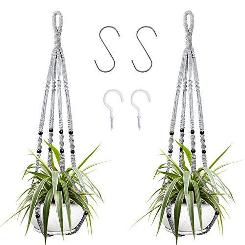 Augshy 2-pack hängande blomkruka i makramé, hängande planteringskorg för inomhusbruk med träpärlor, dekorativ makramé grythängare för heminredning (grå)