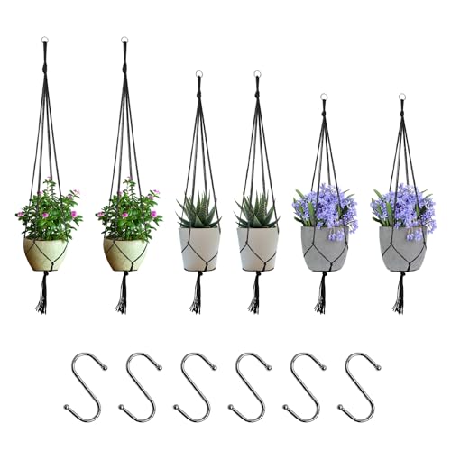 COACOM 6 stycken spets-hängkorg med 6 krokar, hängande bomullsrep, blomkruka, nätpåse, lämplig för inomhus, utomhus, trädgård, terrass, fönster (svart)