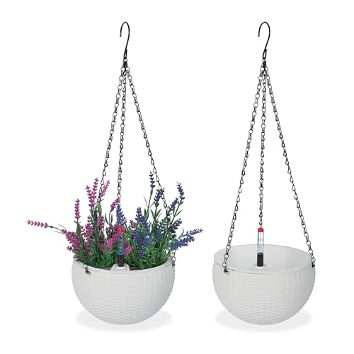Relaxdays Blomampel med vattenbehållare, set om 2, vattendisplay, flätutseende, H x D: 54 x 18,5 cm, hängande blomkruka, vit