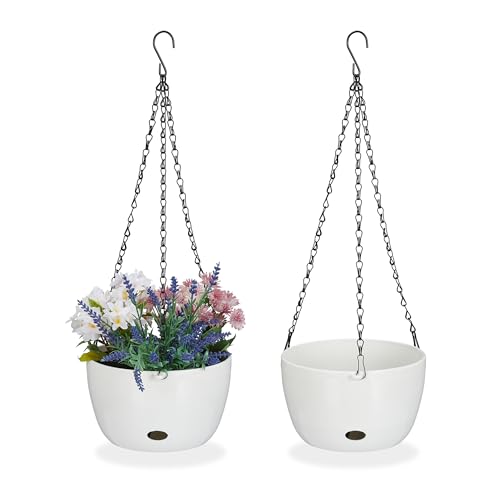 Relaxdays Blomampel med vattenbehållare, set om 2, H x D 60 x 24 cm, utomhus och inomhus, hängande blomkruka, plast, vit
