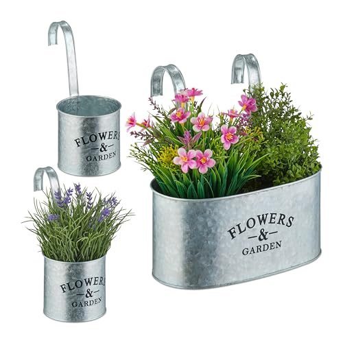 Relaxdays Hängande kruka, set om 3, 2 storlekar, galvaniserad metall, blomkrukor för upphängning, örtkrukor för balkong, silver