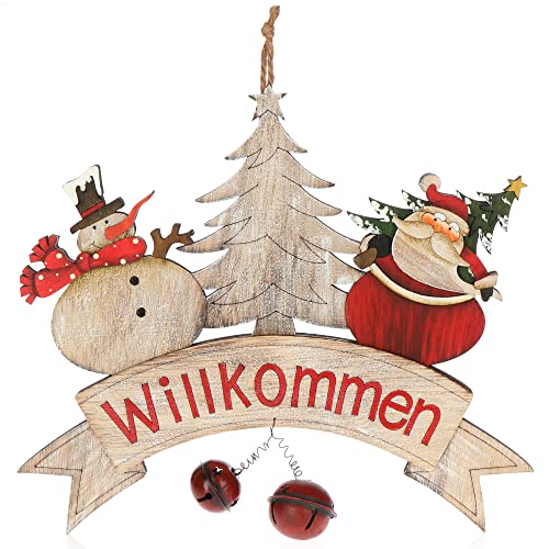 com-four® Hängande dekoration Jul - Bokstavsskylt i trä med liten klocka - Dörrskylt i trä "Willkommen" - Hängare för dörr och fönster