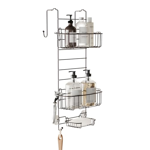 HapiRm 4 nivåer över dörren duschkorg, hängande duschhylla med 22 krokar och 2 tandborsthållare, ingen borrning justerbar hängande duschorganisatör för badrum – svart
