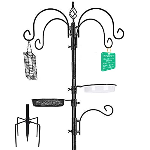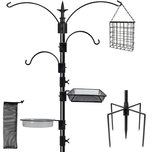 Foderträdgård [uppgraderingsversion justerbar herdekrok fågelmatarstång med 7 spetsar bas, 197 cm höga kraftiga utomhus trädgårdsstänger för hängande fågelmatare, växtkorgar, svart (1-pack)