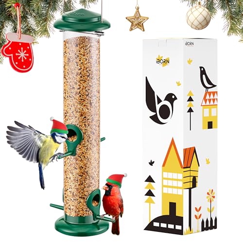 iBorn Fågelmatare i metall, hängande vild fågelfrömatare för blandade fröblandningar, nigerfrömatare, solroshjärta, fågelbad, slitstark helmetall grön finish 35 cm 4 port