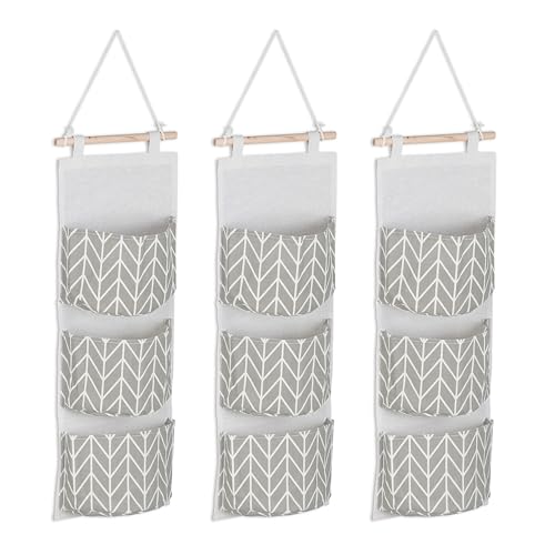 Relaxdays Hängande förvaring, 3 fack, bomull, H x B): 74 x 20 cm, väggorganiserare badrum, hall, kontor, hängande förvaring, grå