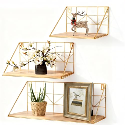 JUJOYBD Vägghylla i guld av trä och metall, set om 3, flytande hylla för sovrum, vardagsrum, kök och kontor, moderna hängande hyllor i 3 storlekar 20 cm, 29 cm, 41 cm