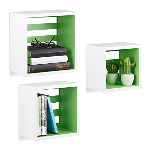 Relaxdays Hängande hyllor, vägghylla, set om 3, fyrkantiga kuber, hyllor för vägg, svävande hyllor, MDF, vit/grön