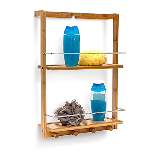 Relaxdays Duschhylla av bambu H x B x D: ca. 53 x 38 x 15,5 cm duschhylla med 2 hyllor av fuktbeständigt trä hängande hylla för badrummet som praktisk hänghylla med 4 handdukskrokar, natur