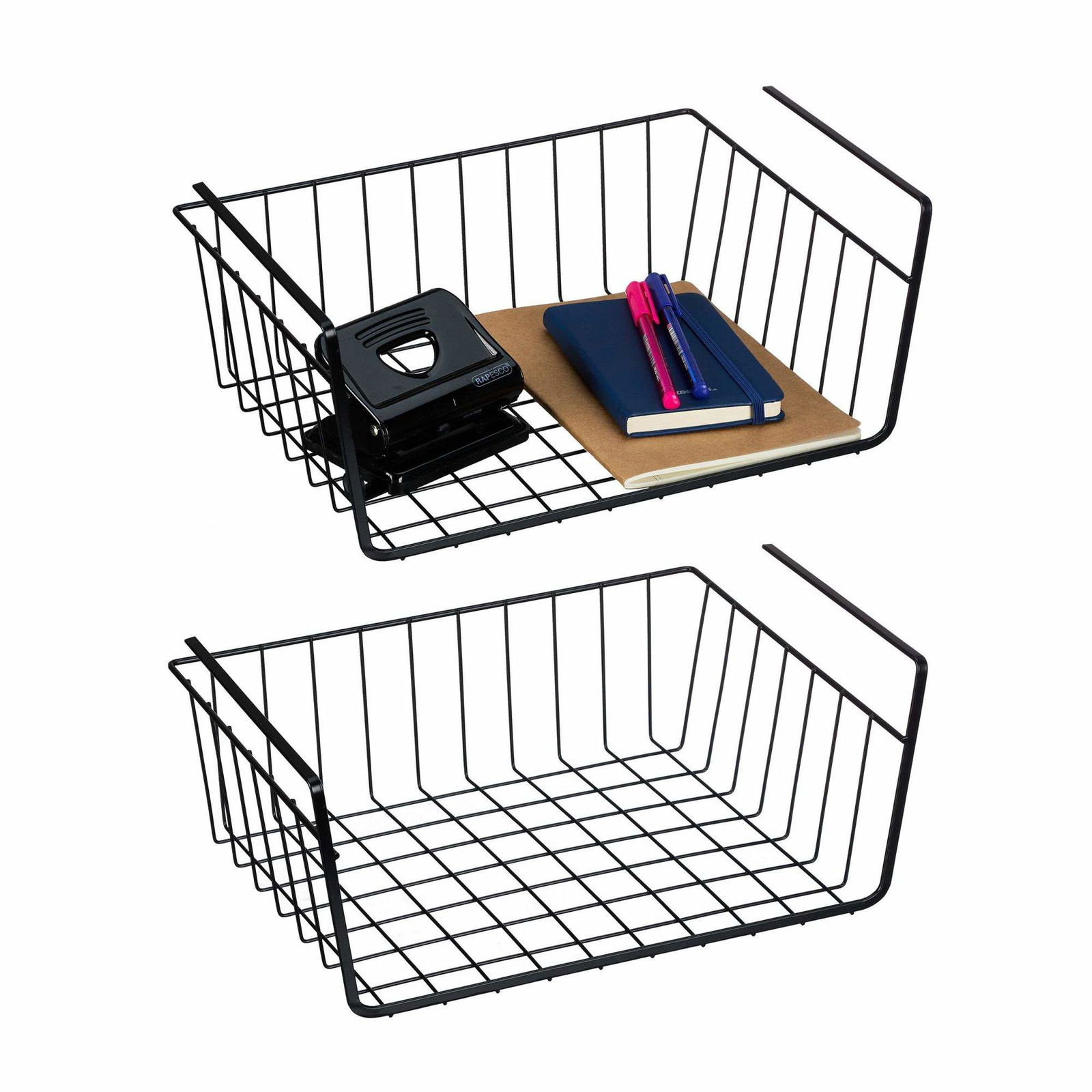 Lonian stapelbar hängande korg, 2-Pack under hyllan hängande metalltråd förvaringskorg för kök, kontor, skafferi, badrum, skåp
