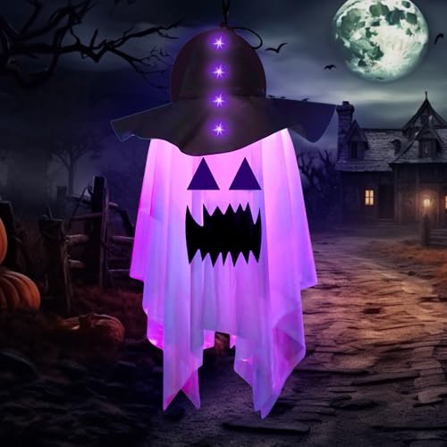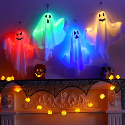 Hängande halloweenspöken med LED-lampor, 4 stycken, halloweendekoration för utomhus, för trädgård, terrass, gräsmatta och trädgård, festdekoration