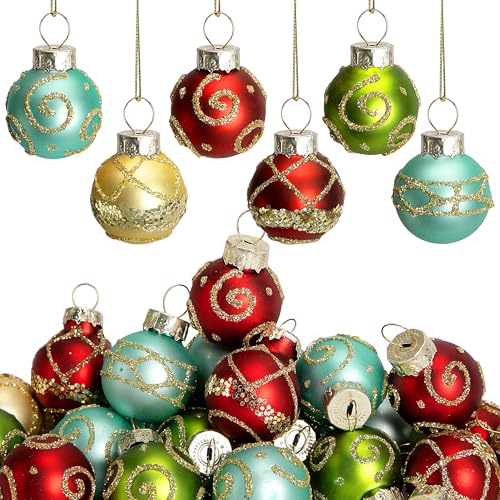Watayo 24 st jul mini flerfärgade bollar glasprydnader – 2,5 cm mini vintage glittrande boll hängande ornament för träd – röd grön guld blå glas liten boll träddekoration för jul heminredning
