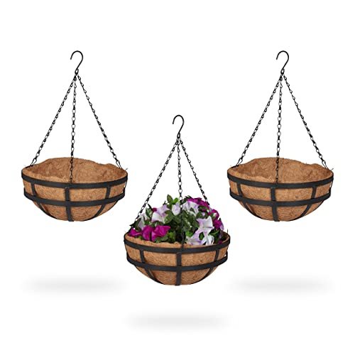 Relaxdays Blomampel set om 3, kokosinlägg, H x D: 50 x 31 cm, hängande växter, inomhus och utomhus, metallram, brun/svart
