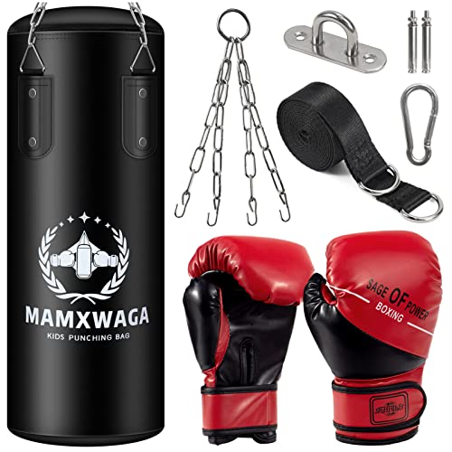 Mamxwaga Hängande boxningssäck set för barn och tonåringar, 2 meter, PU boxningssäck, ofylld med 6 oz, boxningshandskar och hängare i rostfritt stål, punchingsäck i 3–12 år