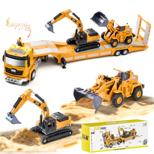 LTFIOON Barn byggarbetsplatsfordon, byggfordon barn 1: 40 lastbilsleksaker, låg lastare med grävmaskin bulldozer,öppen baklucka, avtagbar hängare, biltransportör lastbil i 3 4 5 6 år