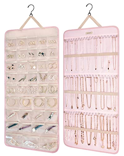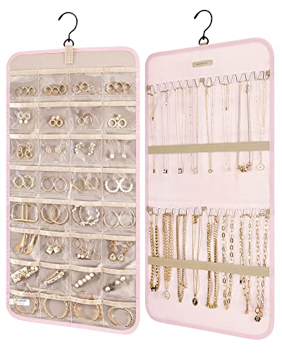 Bagsmart Smyckesförvaring för upphängning, förvaringsrulle med hängare, metallkrok, dubbelsidig smyckeshållare för örhängen, halsband, ringar på skåp, vägg, dörr, 1 st, stor, ROSA, Medium, Modern