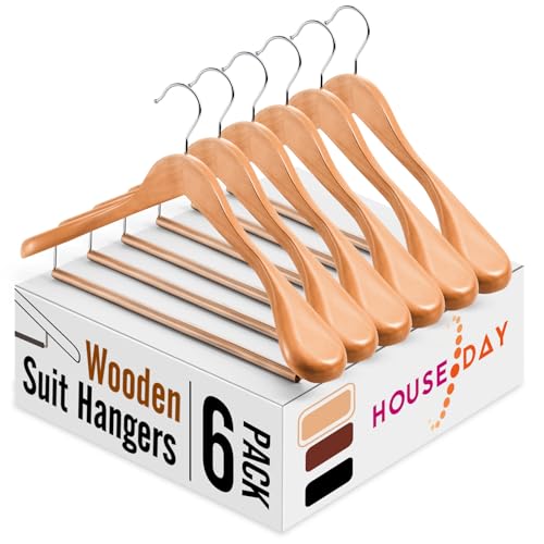 HOUSE DAY 6-pack klädhängare i trä – med halkfri rullande tvärstång trärockshängare, extra breda axelhängare för kläder med 360° vridbar krok, slitstark hängare för jacka, plagg (naturlig)